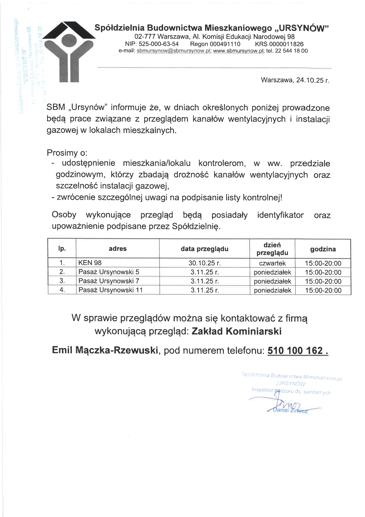 Szczegółowe ogłoszenia będą wywieszane podczas realizacji danego etapu robót.